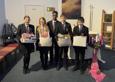 Your generous donations of food goods and gifts were collected by Sean Gilks, Ss Peter and Paul, Yeadon SVP, and taken for distribution to the St Vincent Centre, Leeds. Sean was assisted in school by Elliot Pickard, Year 11. Cards bearing Christmas messages, written by Year 9 pupils were added to the boxes. In the photograph we see representative pupils from 8C who are to be congratulated for their outstanding efforts and generosity in their support of SVP.