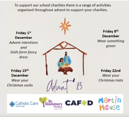 We will begin our usual Advent Appeal on Tuesday 28 of November 2023. We thank you in advance for your support in this, as always, and through supporting your children we are able to support our four main Charities: CAFOD, Catholic Care, St Gemma’s and Martin House who are always so very appreciative of monies raised which then go directly to where it is most needed.