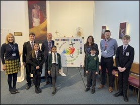 It was a great start to our first day back after the February half term holiday. A big thank you to Joseph Beswick (Year 9), Charlie Beswick (Year 8), Neave Johnson (Year 7), who joined me, Mrs Findlay, Mr Moran and Mr Flanagan on Monday morning. The Jubilee Banner will stay with St Mary’s until Thursday 27 February 2025 when we will transfer it to Sacred Heart Primary School in Ilkley.