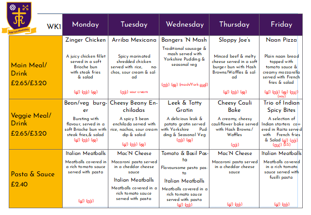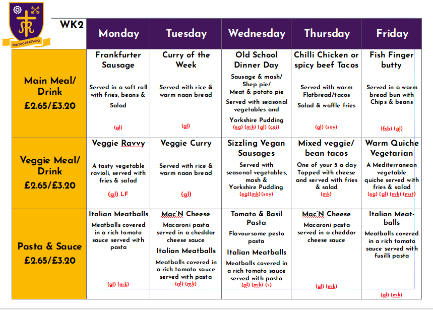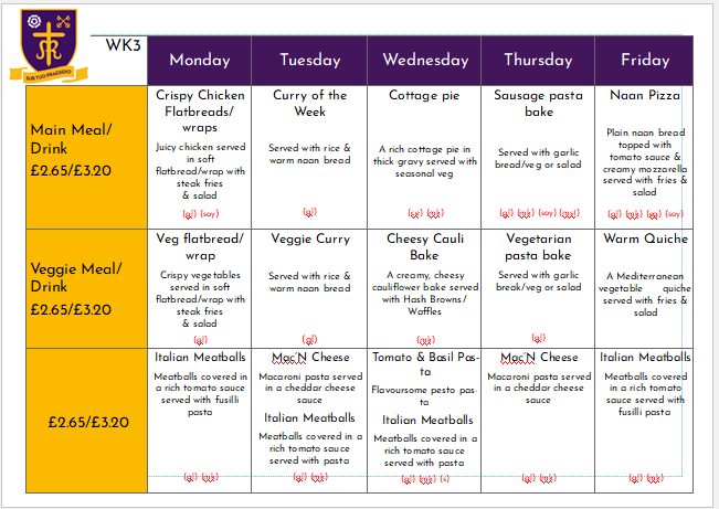 Students have a 30 minute lunch at either 12.10, 12.40 or 13.10 and have a choice of main meals, sandwiches and more. Our current three week rotating menu is as follows: